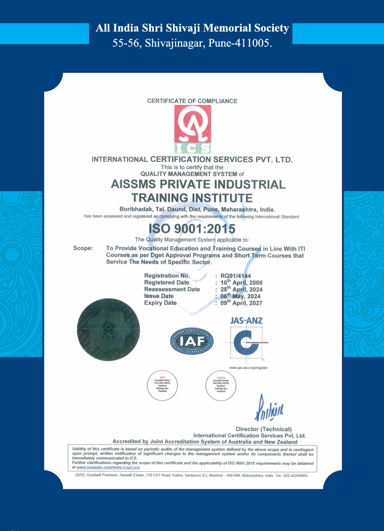 To maintain the grade & quality of each & every member of ITI we got the ISO 9001: 2000 Certification from ICS. For Certification, there was a drastic change in the working method of staff members. For this purpose, the different committees were established. The process was started in Oct 2005 for getting ISO 9001: 2000 certificate & the same was received in 2006 by ICS Our’s is the only ITI in Maharashtra who have received ISO 9001: 2000 Certificate.